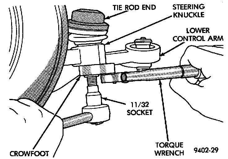 7. Install tie rod end into the steering knuckle. Start tie rod end to steering knuckle attaching nut onto stud of tie rod end. While holding stud of tie rod end stationary, tighten tie rod end to steering knuckle attaching nut. Then using a crowfoot and 11/32 socket, torque tie rod end attaching nut to 55 Nm (40 ft. lbs.).