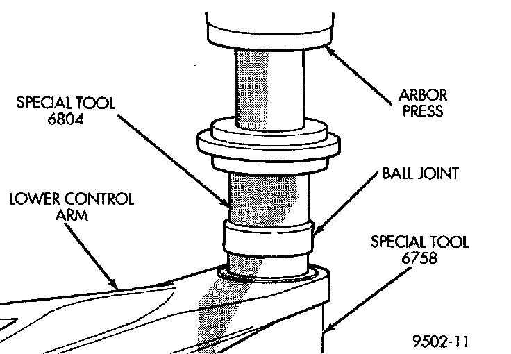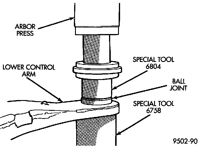 5. Position the arm and ball joint in an arbor press in the upside-down position placing Receiving Cup, Special Tool 6758, under the lower control arm where the ball joint is positioned. Install Remover/Installer, Special Tool 6804, on top of the bottom of the ball joint.