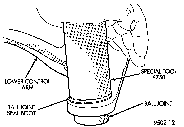 8. Position Receiving Cup, Special Tool 6758, over the sealing boot outer diameter so it is aligned with bottom the edge of sealing boot. By hand, apply pressure to the top of the receiving cup until the sealing boot is pressed squarely against top surface of lower control arm.