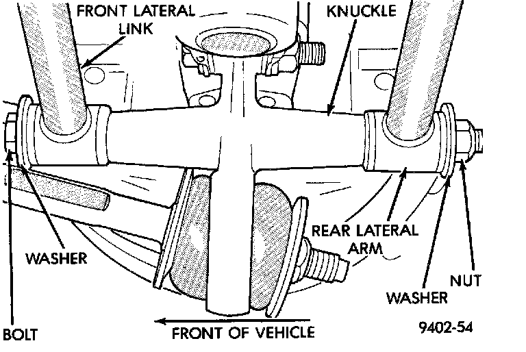 1. Install the washer on the short lateral arm mounting bolt. Then install the short lateral arm mounting bolt through one end of the lateral arm having the same size bushing sleeves. Then install the bolt through the mounting hole in the knuckle from the front so the head of bolt is facing toward the front of the vehicle.