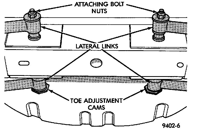 3. Install toe adjustment cam on the long lateral arm mounting bolt. Install the long mounting bolt with the adjustment cam into the rearward mounted lateral arm having the large bushing sleeve. Then pass the mounting bolt through the rear crossmember. The head of this bolt must face the rear of the vehicle when installed.