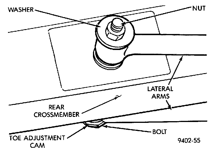4. Remove nut, bolt, washer and toe adjustment cam, attaching the lateral arms to the rear crossmember. Then remove the lateral arms from vehicle.