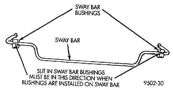 1. Install the stabilizer bar bushings on the bar by opening the slits in the bushings and sliding them on the stabilizer bar at the portion of the bar which comes closest to each frame rail. When the bushings are installed on the stabilizer bar, the slit in the bushing must face the rear of the vehicle.
