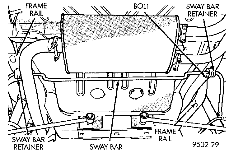 4. With the suspension at curb height, securely tighten the stabilizer bar retainer to frame rail attaching bolts to a torque of 34 Nm (300 inch lbs.).