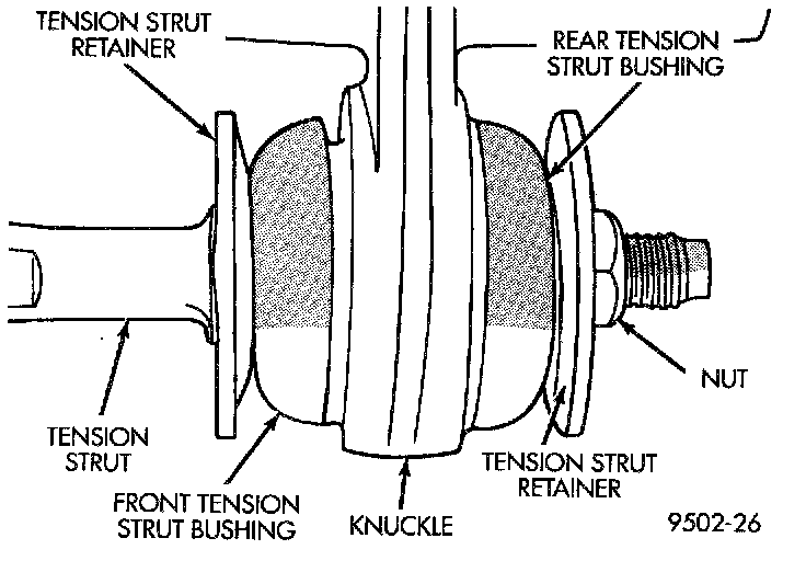 7. Insert the other end of the tension strut into the lower hole in the knuckle. Install the remaining tension strut bushing half onto the trailing end of the tension strut. Be sure the stepped area of the bushing is squarely seated into the hole in the knuckle. Install the tension strut retainer and nut on the trailing end of the tension strut. Make sure the cupped side of the retainer points outward away from the knuckle.