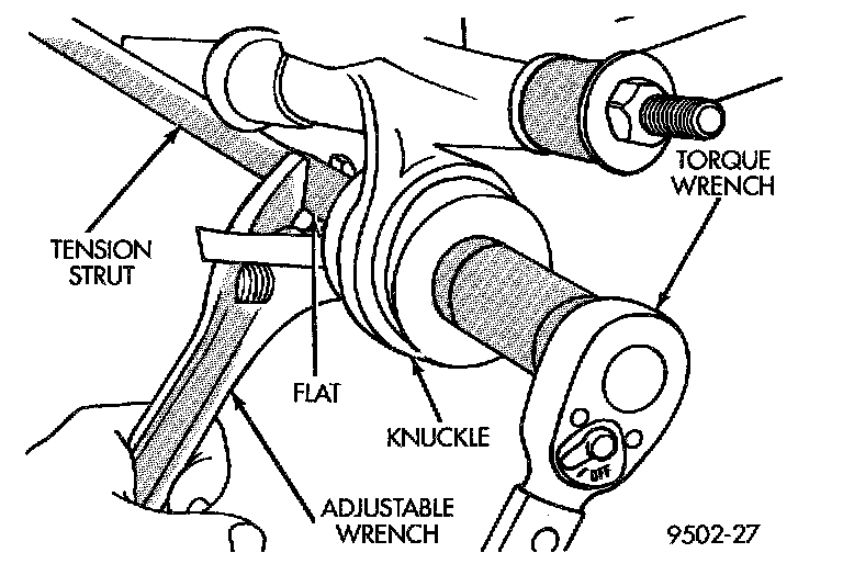 9. Position a wrench on the flat of the tension strut to keep it from turning, and then torque the rear tension strut nut to 95 Nm (70 ft. lbs.).