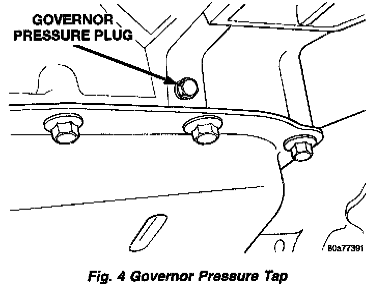 2. Operate transaxle in third gear to read pressures. The governor pressure should respond smoothly to changes in mph and should return to 0 to 3 psi when vehicle is stopped. High pressure (above 3 psi) at standstill will prevent the transaxle &from downshifting.