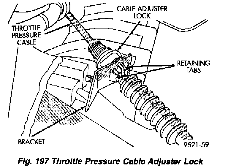 THROTTLE PRESSURE CABLE ADJUSTMENT PROCEDUREThe throttle pressure cable adjustment is very important to proper transaxle operation. This adjustment positions a valve which controls shift speed, shift quality, and part throttle downshift sensitivity. If the setting is too long, early shifts and slippage between shifts may occur. If the setting is too short, shifts may be delayed and part throttle downshifts may be very sensitive.