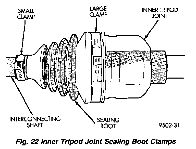 2. Remove large boot clamp that retains inner tripod joint sealing boot to tripod joint housing and discard. Then remove small clamp that retains inner tripod joint sealing boot to interconnecting shaft and discard. Remove the sealing boot from the tripod housing and slide it down the interconnecting shaft.