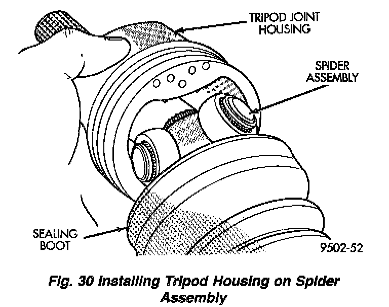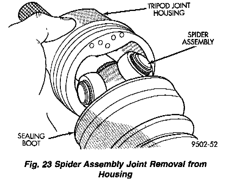 The inner tripod joints use no internal retention in the tripod housing to keep the spider assembly in the housing. Therefore, do not pull on the interconnecting shaft to disengage tripod housing from transmission stub shaft. Removal in this manner will cause damage to the inboard joint sealing boots.
