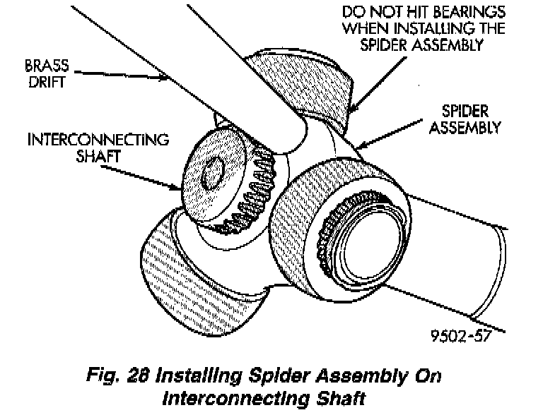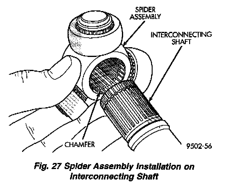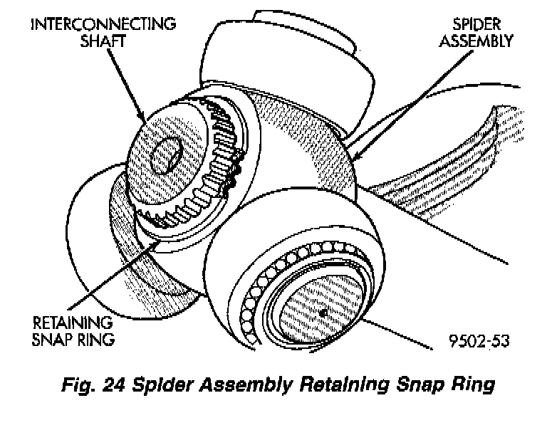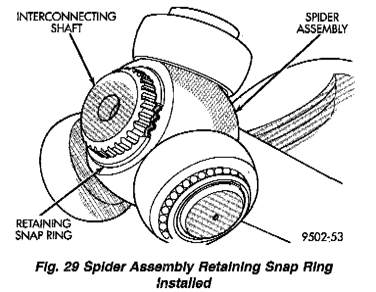 3. Install the spider assembly to interconnecting shaft retaining snap ring into groove on end of interconnecting shaft. Be sure the snap ring is fully seated into groove on interconnecting shaft.