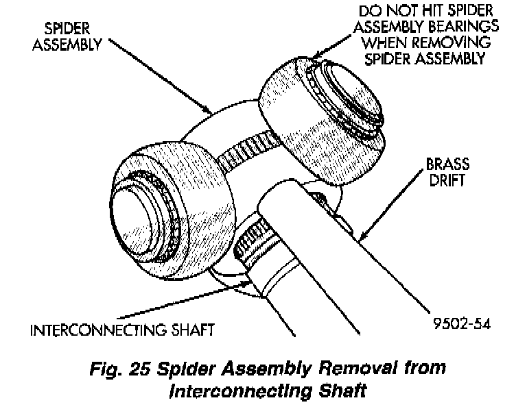 4. Remove snap ring that retains spider assembly to interconnecting shaft. Remove the spider assembly from interconnecting shaft. If spider assembly will not come off interconnecting shaft by hand, it can be removed by tapping spider assembly with a brass drift. Do not hit the outer tripod bearings in an attempt to remove spider assembly from interconnecting shaft.