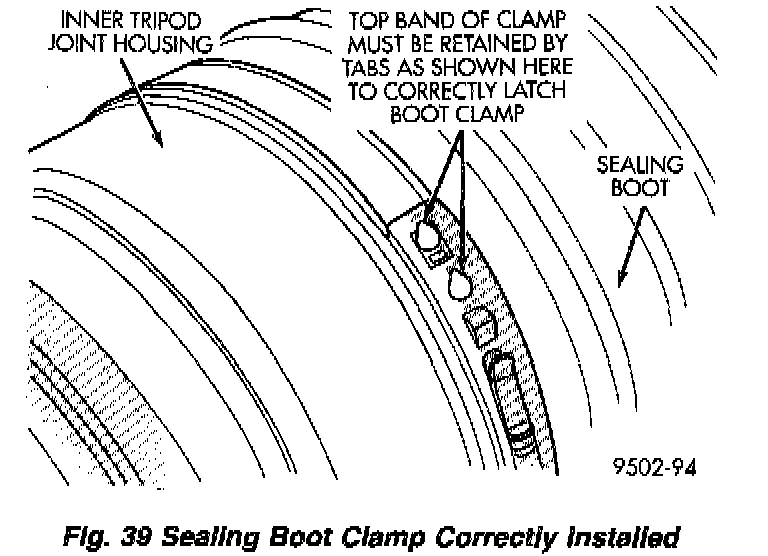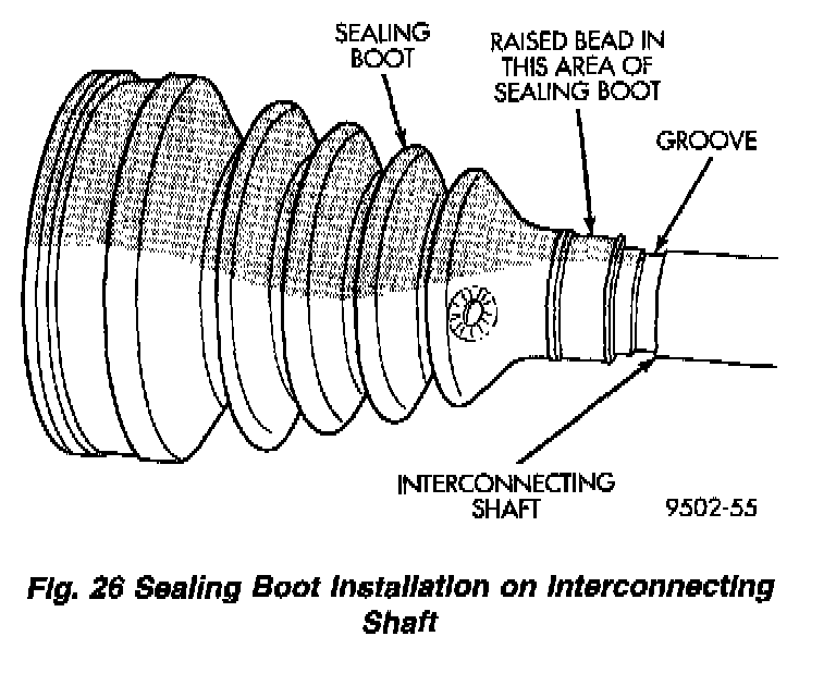 1. Slide inner tripod joint seal boot retaining clamp, onto interconnecting shaft. Then slide the replacement inner tripod joint sealing boot onto interconnecting shaft. Inner tripod joint seal boot MUST be positioned on interconnecting shaft, so the raised bead on the inside of the seal boot is in groove on interconnecting shaft.