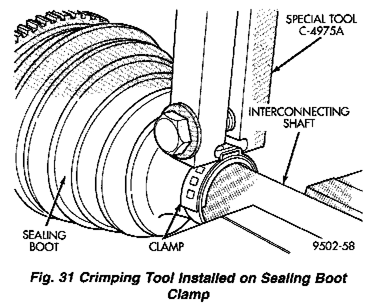 7. Clamp sealing boot onto interconnecting shaft using crimper, Special Tool C-4975-A and the following procedure. Place crimping tool C- 4975-A over bridge of clamp. Tighten nut on crimping tool C- 4975-A until jaws on tool are closed completely together, face to face.