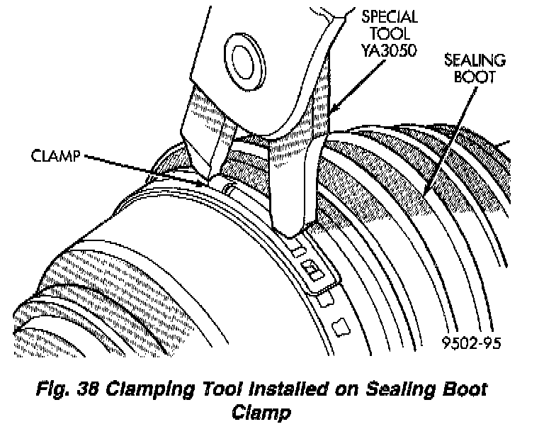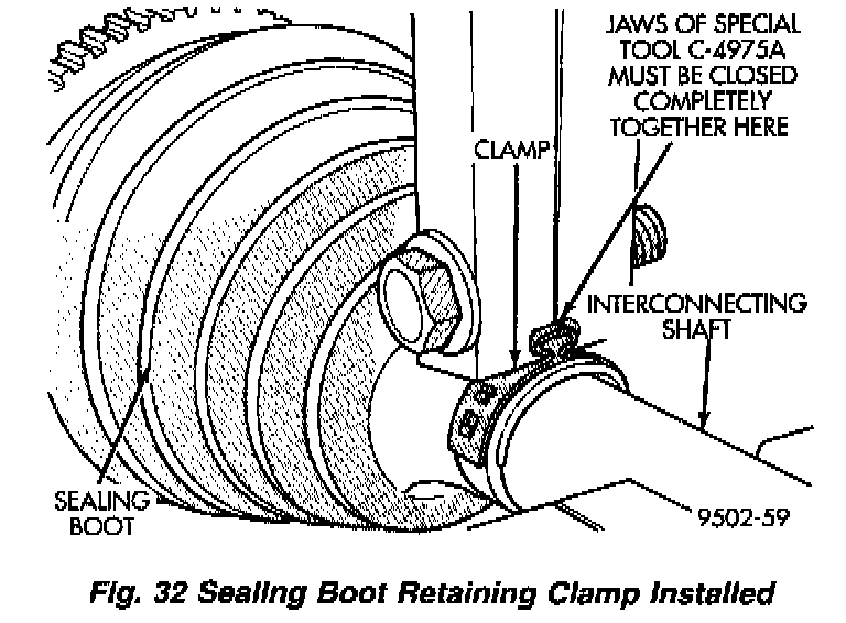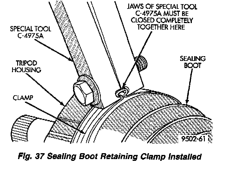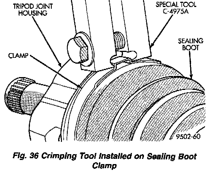 11 Clamp tripod joint sealing boot to tripod joint using required procedure for type of boot clamp application. If seal boot uses crimp type boot clamp, clamp sealing boot onto tripod housing using crimper, Special Tool C-4975-A. Place crimping tool C-4975-A over bridge of clamp. Tighten nut on crimping tool C-4975-A until jaws on tool are closed completely together, face-to-face.