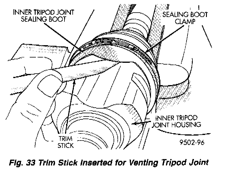 9. Insert a trim stick between the tripod joint and the sealing boot to vent inner tripod joint assembly. When inserting trim stick between tripod housing and sealing boot, ensure trim stick is held flat and firmly against the tripod housing. If this is not done, damage to the sealing boot can occur. If inner tripod joint has a Hytrel (hard plastic) sealing boot, be sure trim stick is inserted between soft rubber insert and tripod housing, and not the hard plastic sealing boot and soft rubber insert.
