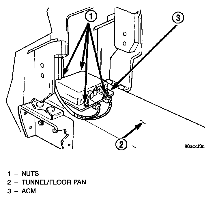 For installation, reverse the above procedure. Position ACM (arrow pointing forward) in the console floor bracket, attach the nuts and tighten to 11 - 14 Nm (105 - 125 in. lbs.) torque.