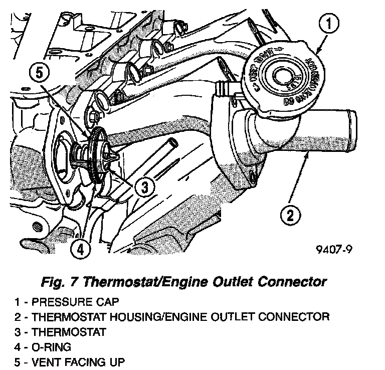 2. Place the new thermostat assembly into the thermostat housing/outlet connector. Align vent with notch in cylinder head.