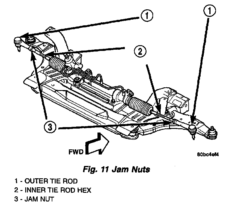 1. Loosen the tie rod adjusting jam nuts. Grasp each inner tie rod at its hex and rotate it one way or the other until the front wheel toe is set to the preferred specification.