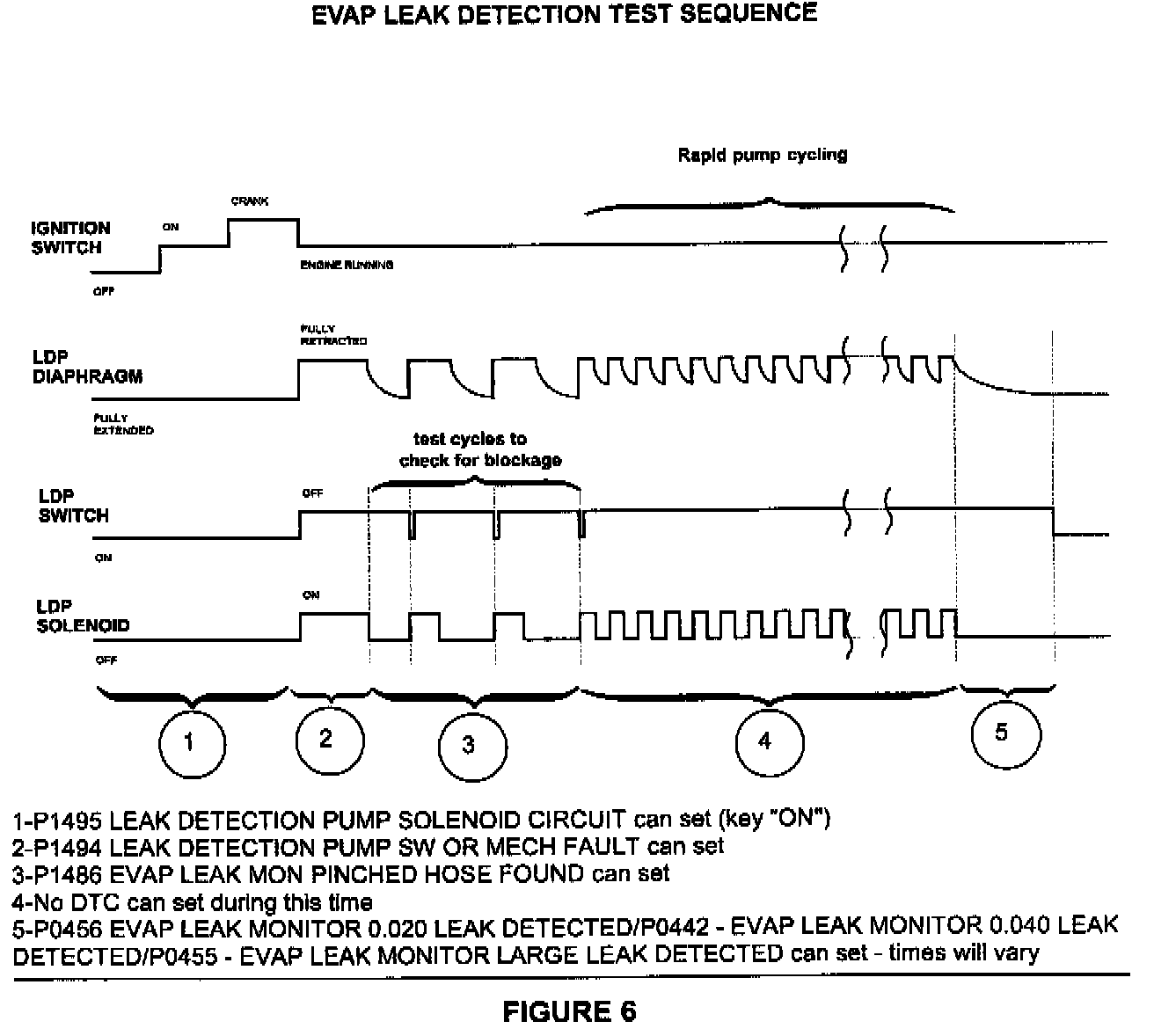 During diagnosis, you can compare the LDP solenoid activity with the monitor sequence in Figure 6. If the PCM detects a problem that could set a DTC, the testing is halted and LDP solenoid activity will stop. As each section of the test begins, it indicates that the previous section passed successfully. By watching to see which tests complete, you can see if any conditions are present that the PCM considers abnormal.