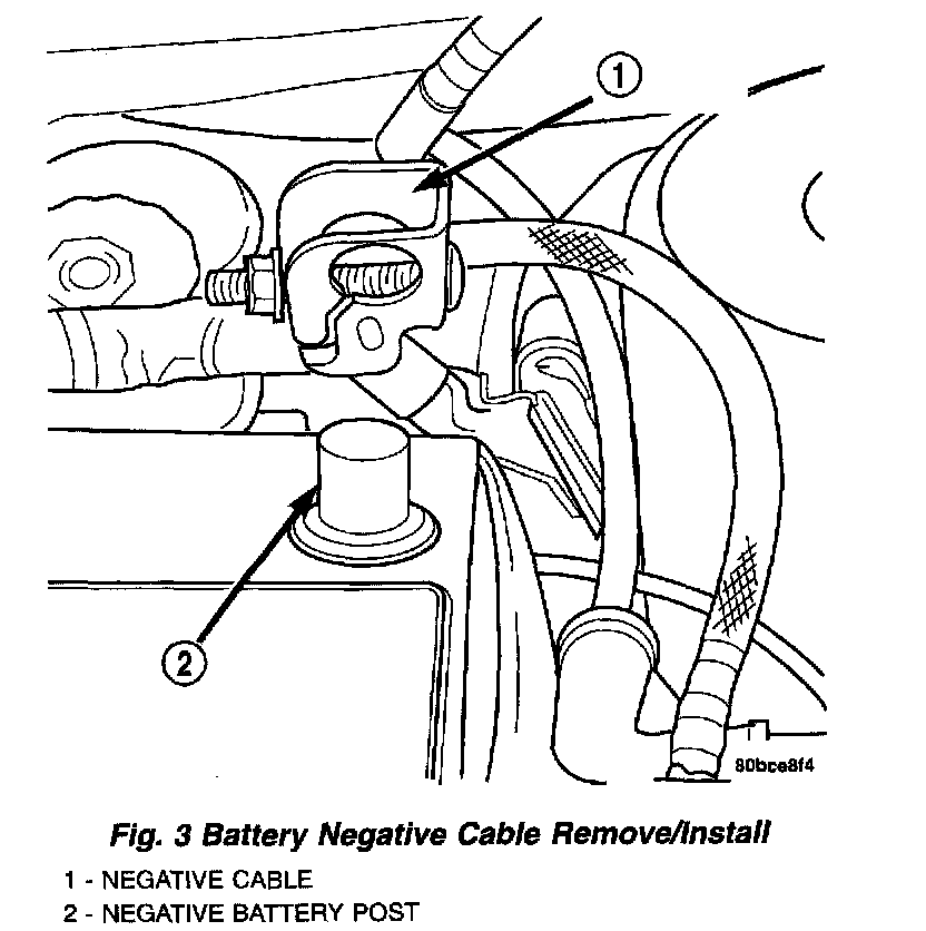 1. Disconnect and isolate the battery negative cable (Fig. 3). for complete circuit diagrams, refer to the appropriate wiring information. The wiring information includes wiring diagrams, proper wire and connector repair procedures, details of wire harness routing and retention, connector pin-out information and location views for the various wire harness connectors, splices and grounds.