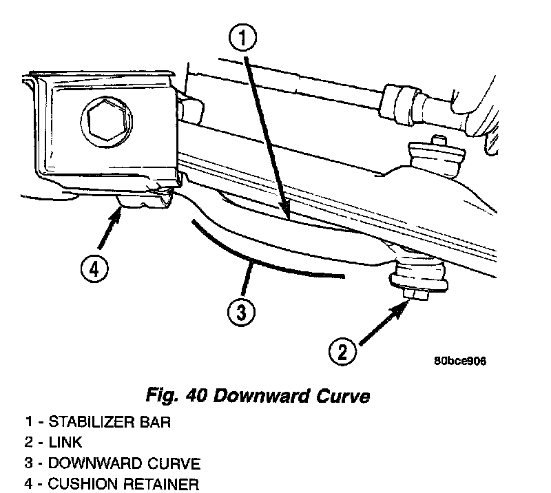NOTE: Before installing the stabilizer bar, make sure the bar is not upside-down. The stabilizer bar must be installed with the curve on the outboard ends of the bar facing downward to clear the control arms once fully installed.
