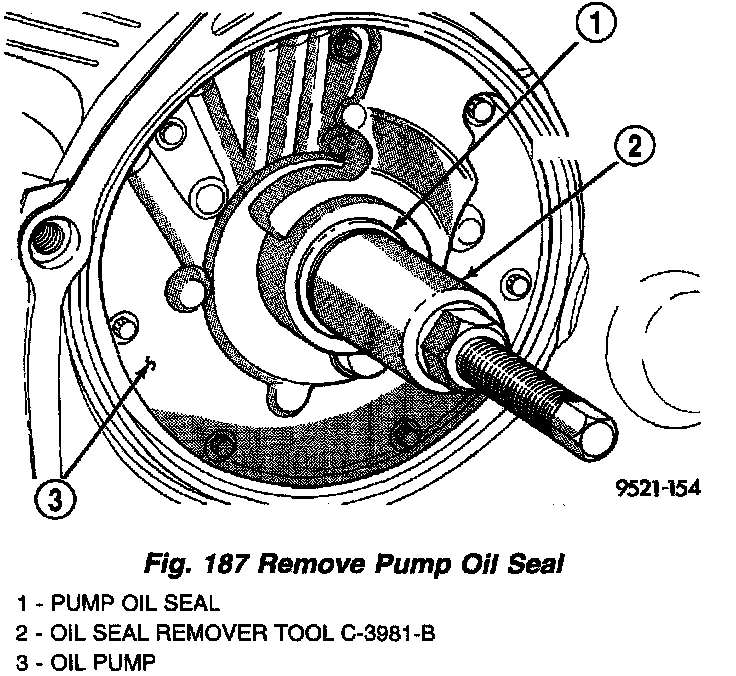 1. To install a new seal, place seal in opening of the pump housing (lip side facing inward). Using Tool C-4193 and Handle Tool C-4171, drive new seal into housing until tool bottoms (Fig. 188).