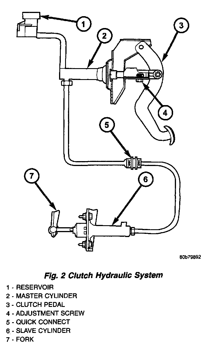 The clutch hydraulic system (Fig. 2) consists of a clutch master cylinder and integral reservoir, a clutch slave cylinder and integral damper, and an interconnecting fluid line.
