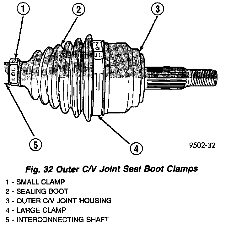 2. Remove large boot clamp retaining C/V joint sealing boot to C/V joint housing (Fig. 32) and discard. Remove small clamp that retains outer C/V joint sealing boot to interconnecting shaft and discard. Remove sealing boot from outer C/V joint housing and slide it down interconnecting shaft.