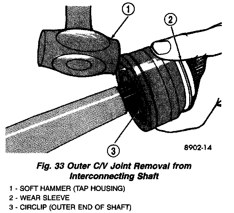 4. Remove outer C/V joint from interconnecting shaft using the following procedure: Support interconnecting shaft in a vise equipped with protective caps on jaws of vise to prevent damage to interconnecting shaft. Then, using a soft-faced hammer,sharply hit the end of the C/V joint housing to dislodge housing from internal circlip on interconnecting shaft (Fig. 33). Then slide outer C/V joint off end of interconnecting shaft, joint may have to be tapped off shaft using a soft-faced hammer.