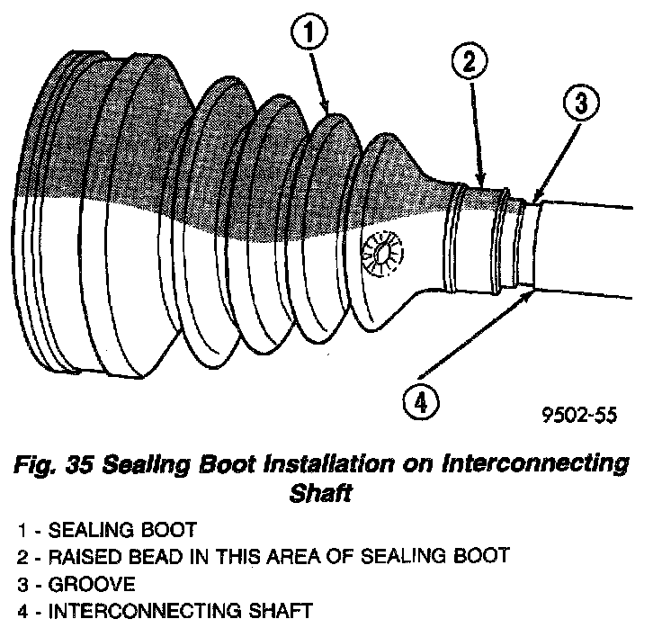 1. Slide new sealing boot to interconnecting shaft retaining clamp onto interconnecting shaft. Slide the outer C/V joint assembly sealing boot onto the interconnecting shaft (Fig. 35). Seal boot MUST be positioned on interconnecting shaft so the raised bead on the inside of the seal boot is in groove on interconnecting shaft.
