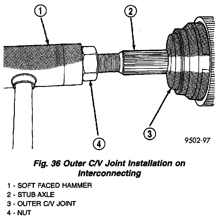 3. Install outer C/V joint assembly onto interconnecting shaft by using a soft-faced hammer and tapping end of stub axle (with nut installed) until outer C/V joint is fully seated on interconnecting shaft (Fig. 36).