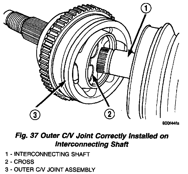4. Outer C/V joint assembly must be installed on interconnecting shaft until cross of outer C/V joint assembly is seated against circlip on interconnecting shaft (Fig. 37).