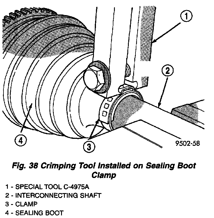 7. Clamp sealing boot onto interconnecting shaft using crimper, Special Tool C-4975-A and the following procedure. Place crimping tool C-4975-A over bridge of clamp (Fig. 38). Tighten nut on crimping tool C-4975-A until jaws on tool are closed completely together, face to face (Fig. 39).