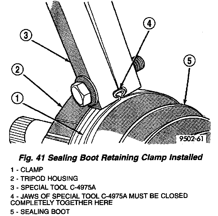 9. Clamp sealing boot onto outer C/V joint housing using Crimper, Special Tool C-4975-A and the following procedure. Place crimping tool C-4975-A over bridge of clamp (Fig. 40). Tighten nut on crimping tool C-4975-A until jaws on tool are closed completely together, face to face (Fig. 41).