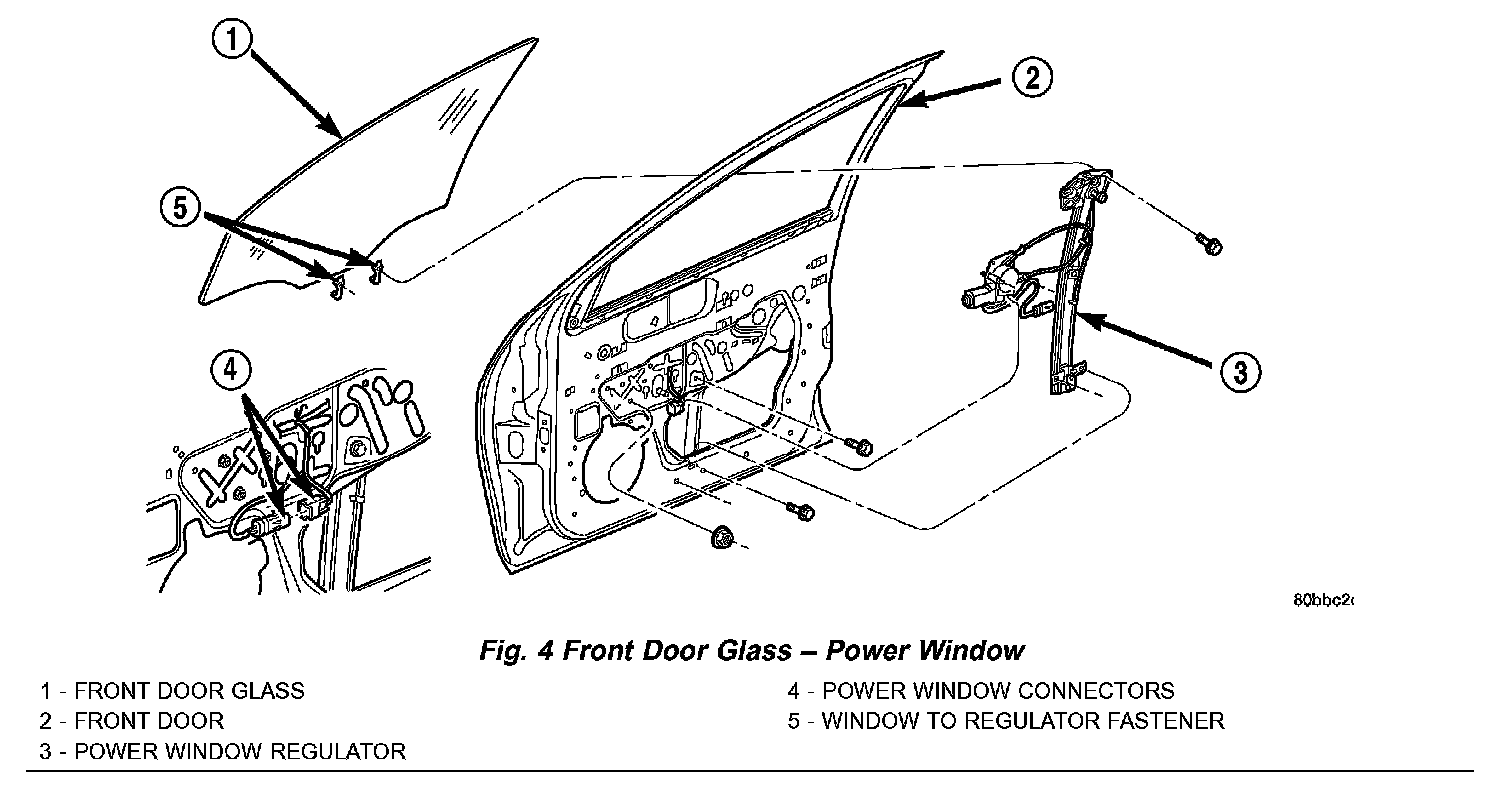 5. Remove bolts attaching door glass to window regulator lift plates (Fig. 4) and (Fig. 5).