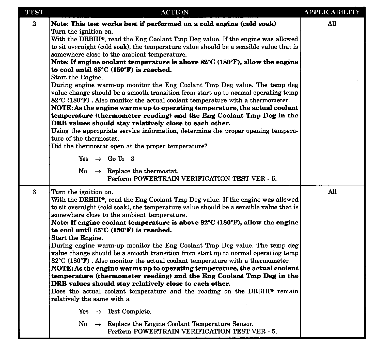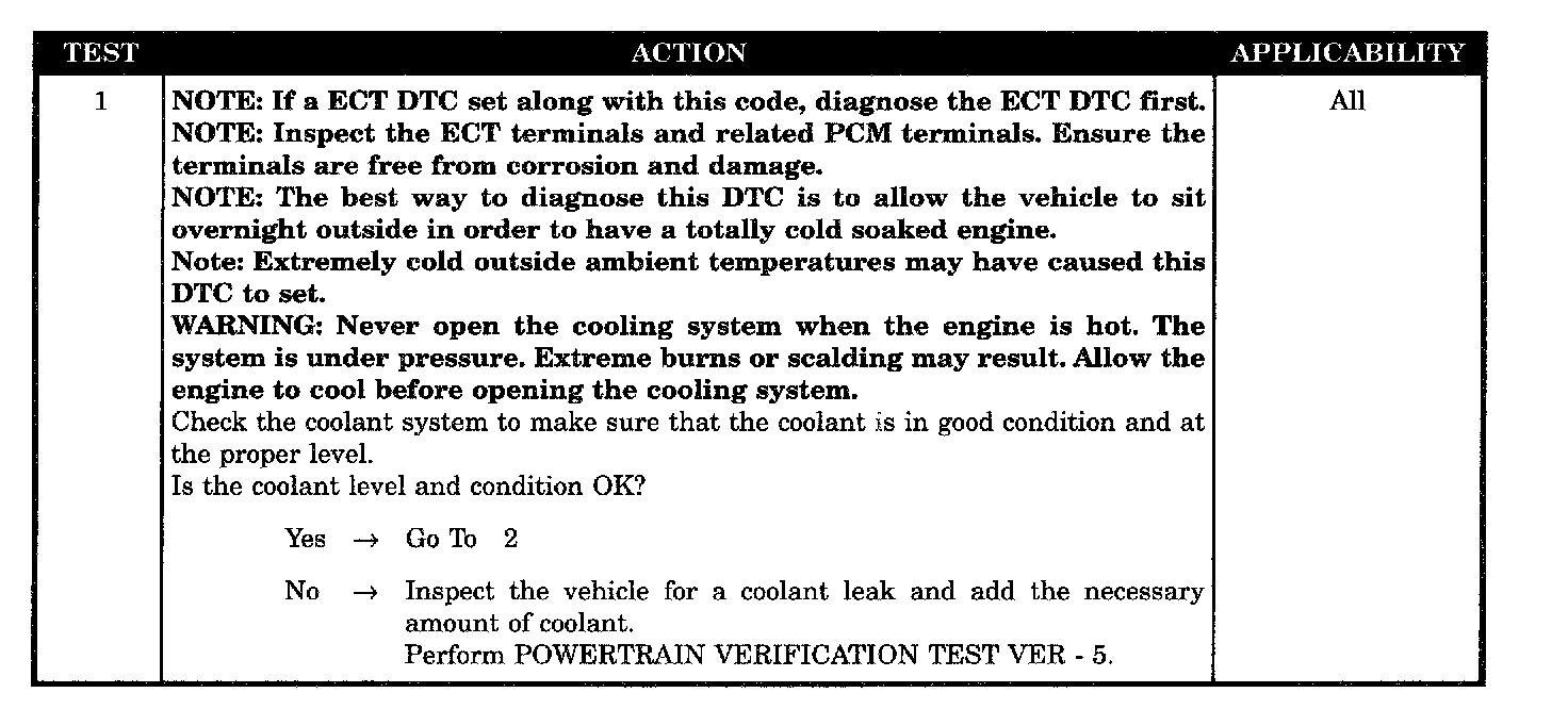 The engine temperature does not go above 15 °C (60 °F). Failure time depends on start-up coolant temperature and ambient temperature. (i.e. 2 minutes for a start temp of 10 °C (50 °F) or up to 10 minutes for a vehicle with a start-up temp of -28 °C (20 °F). Two trips are required to set this DTC.