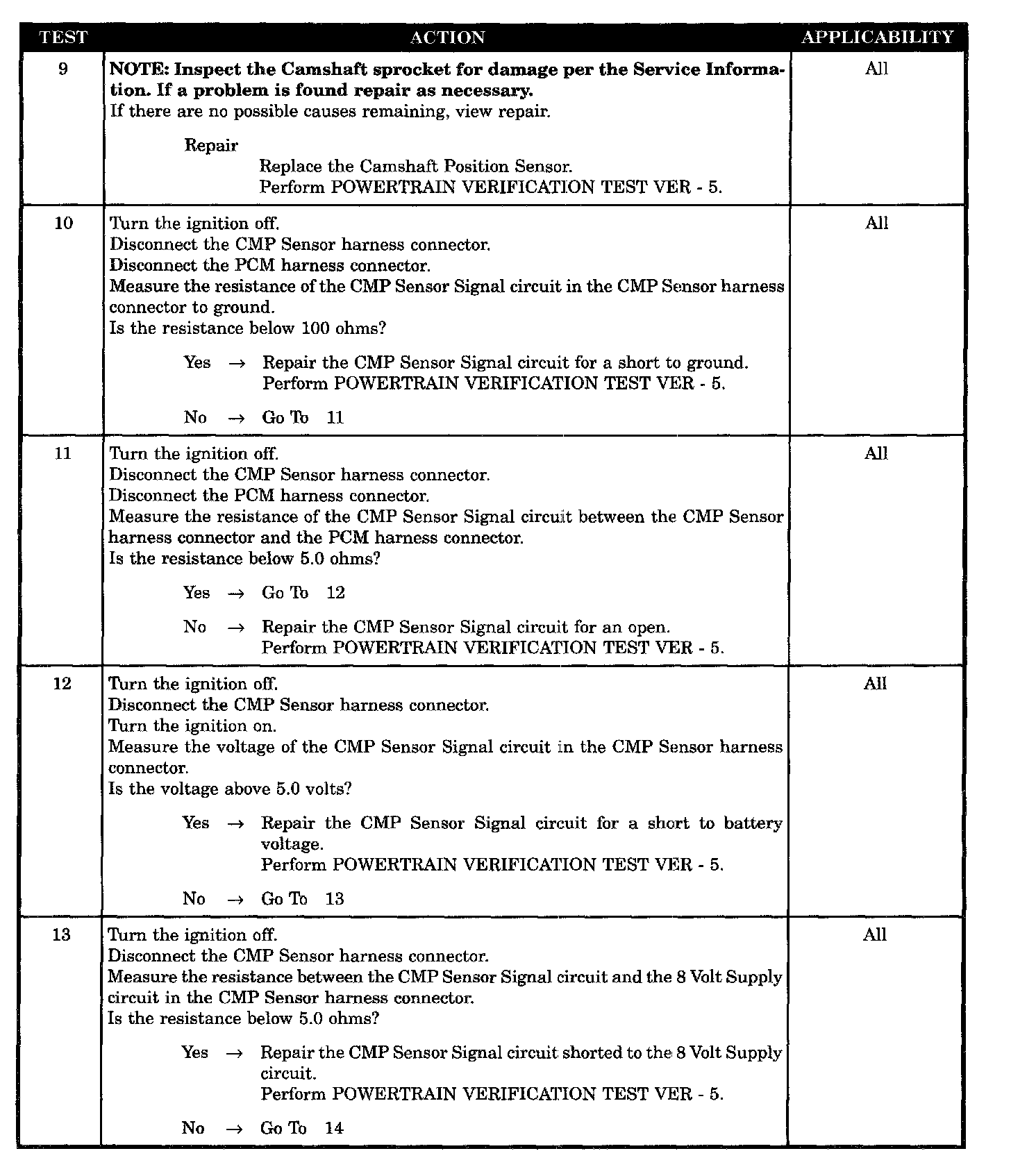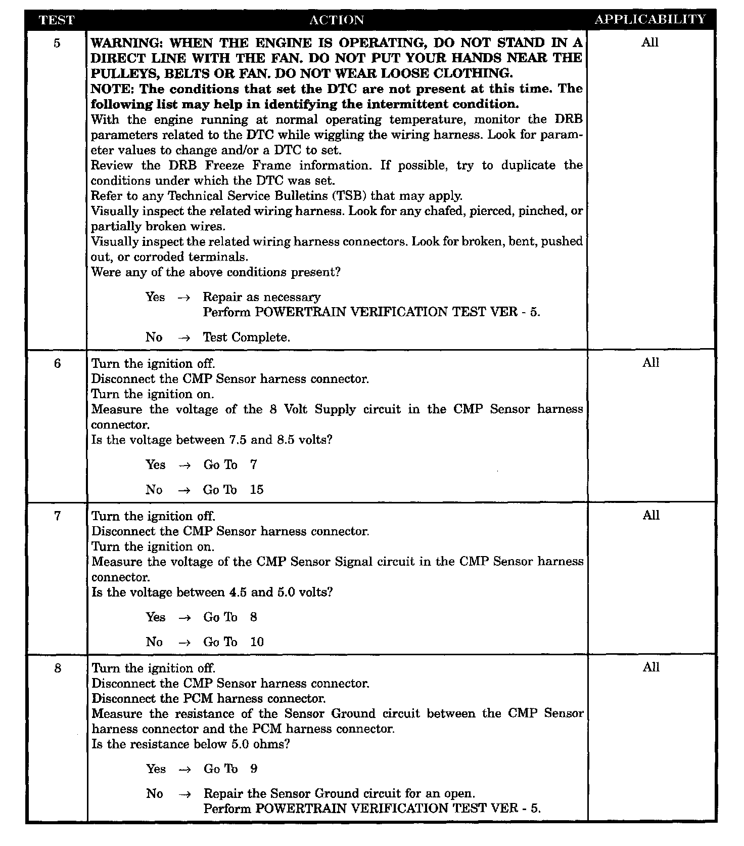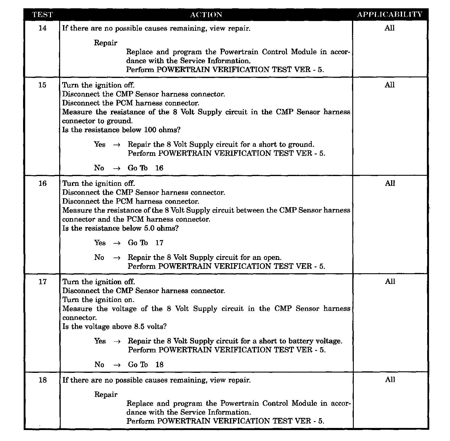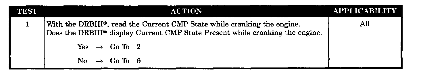 At least 5 seconds or 2.5 engine revolutions have elapsed with crankshaft position sensor signals present but no camshaft position sensor signal.