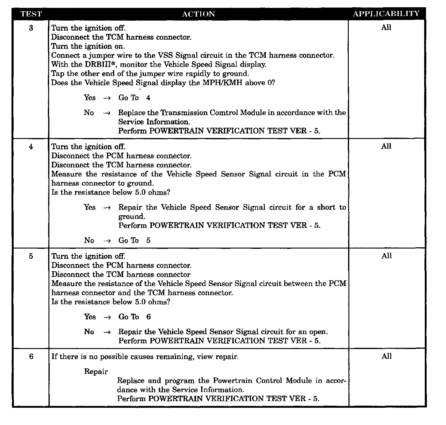 This code will set if no vehicle speed signal is received from the TCM (transmission control module) for more than 11 seconds for 2 consecutive trips.