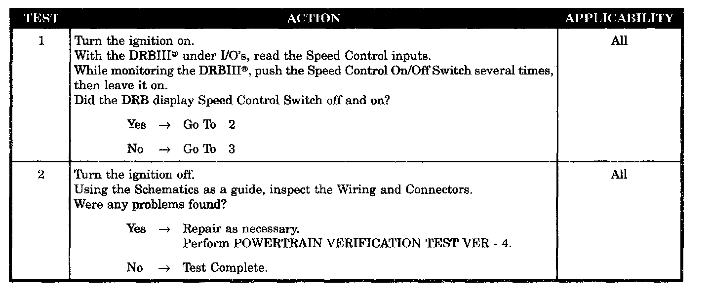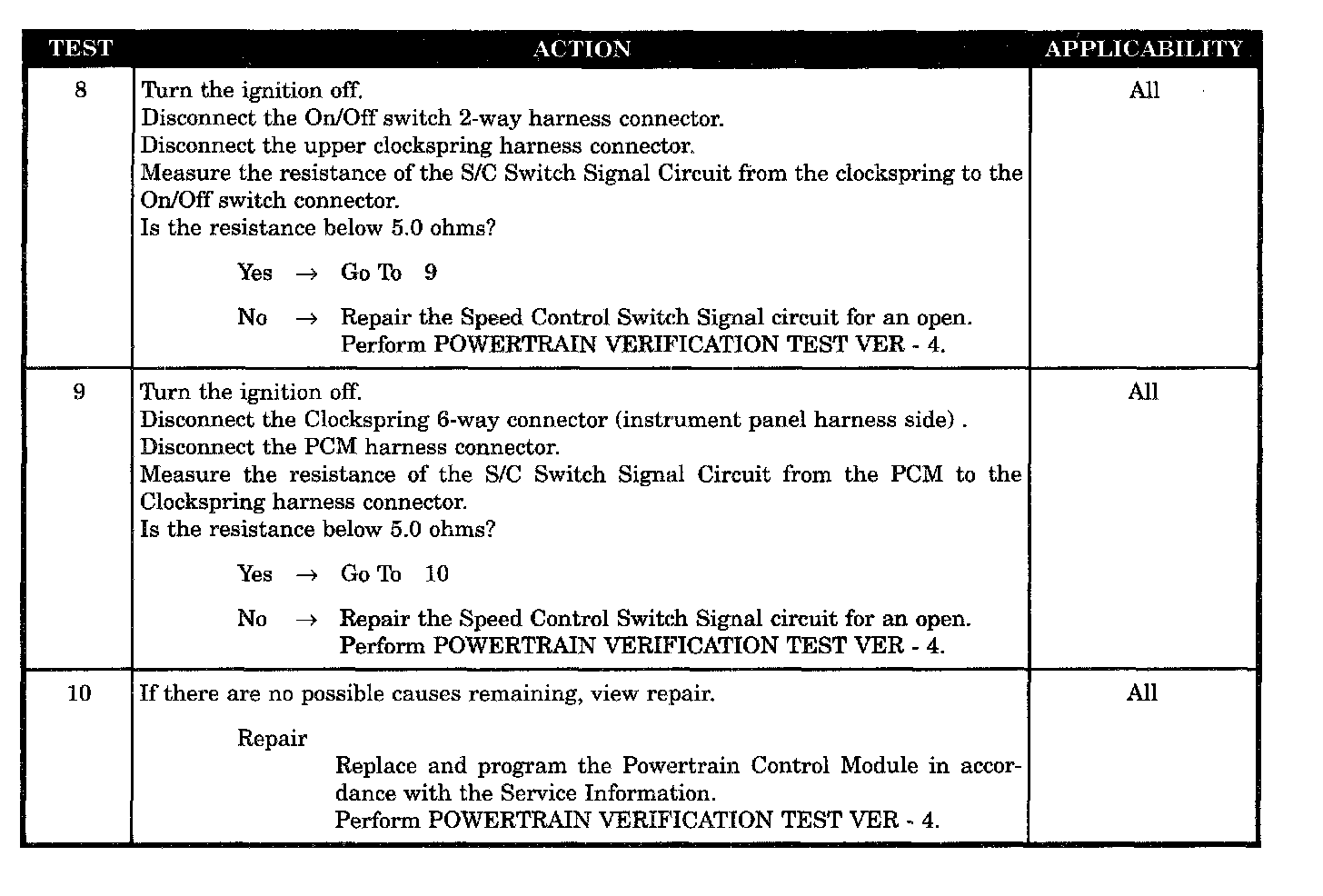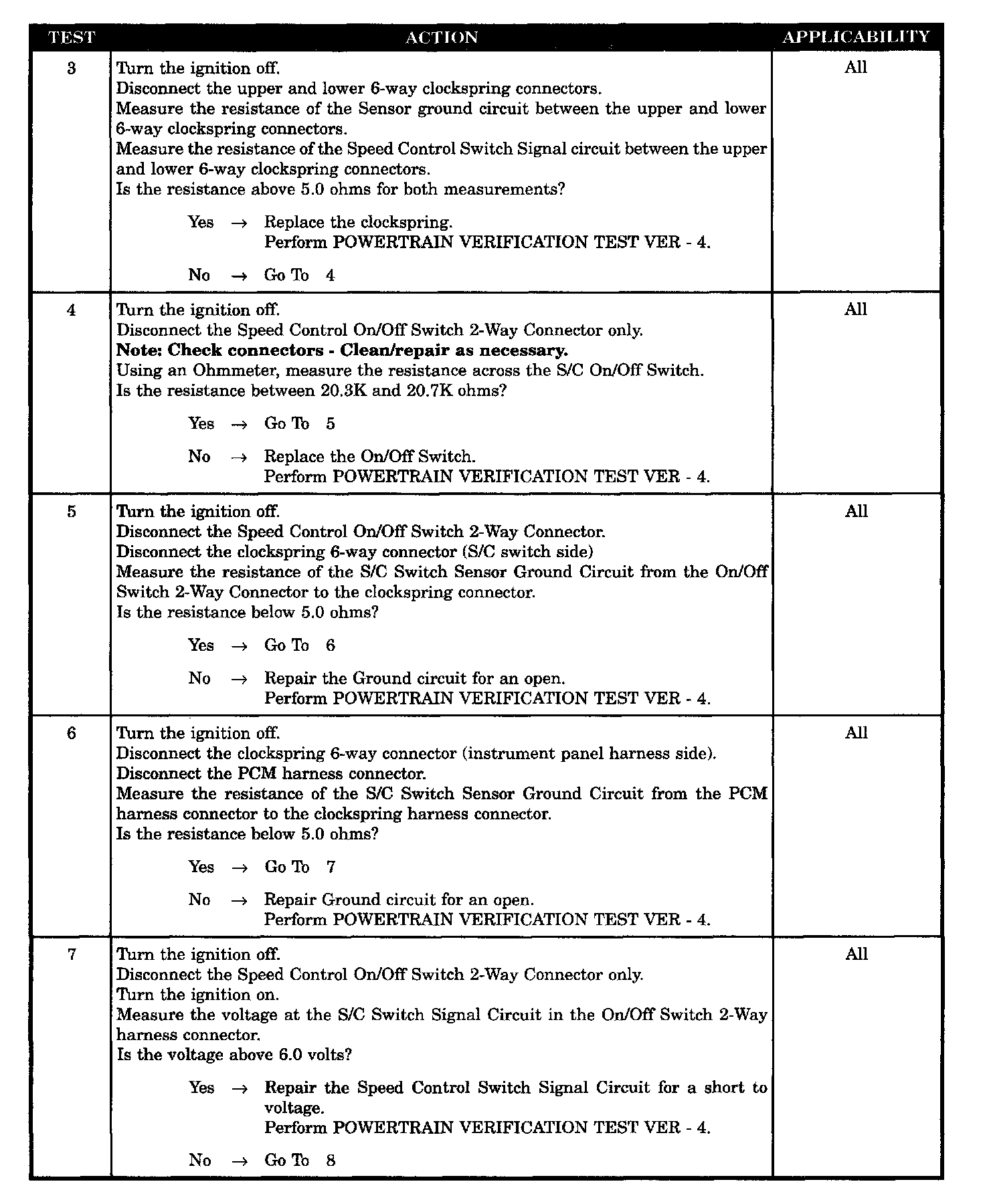 An open circuit is detected in the speed control ON/OFF switch circuit. The circuit must be above 4.8 volts for more than 2 minutes to set the DTC.