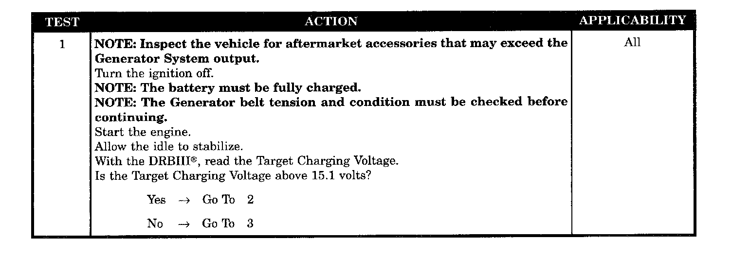 The battery sensed voltage is 1 volt below the charging goal for 13.47 seconds. The PCM senses the battery voltage turns OFF the field driver and senses the battery voltage again. If the voltages are the same, the code is set.