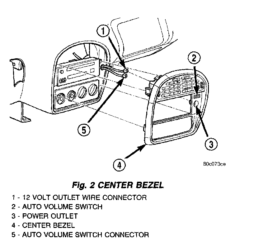2. Pull center bezel straight rearward along the sides of the radio and A/C control openings to disengage four clips (Fig. 2).