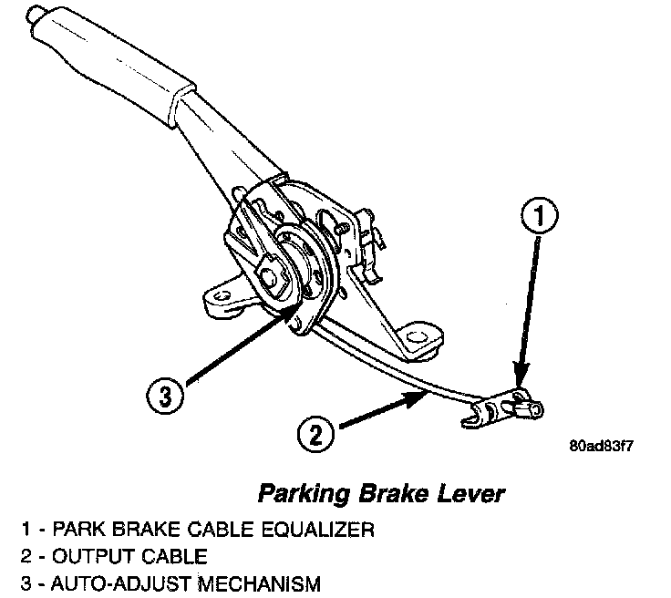 The parking brake lever is an auto-adjust type which continuously applies minimal tension to the parking brake cables to keep them in adjustment at all times. Due to this feature, the park brake cable system does not require manual adjustment. Proper parking brake system adjustment is obtained by proper drum-in-hat brake shoe adjustment.