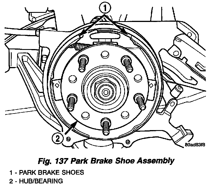 The parking brake located at each rear wheel consists of a small duo-servo brake assembly mounted to the disc brake caliper adapter.