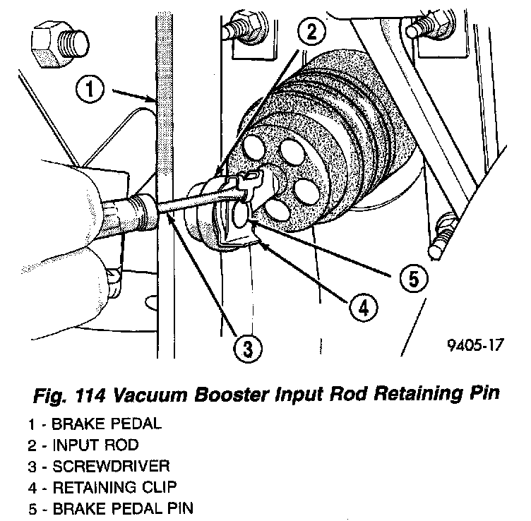 9. Locate the vacuum booster input rod to brake pedal connection under the instrument panel. Position a small screwdriver between the center tang on the power brake booster input rod to brake pedal pin retaining clip.