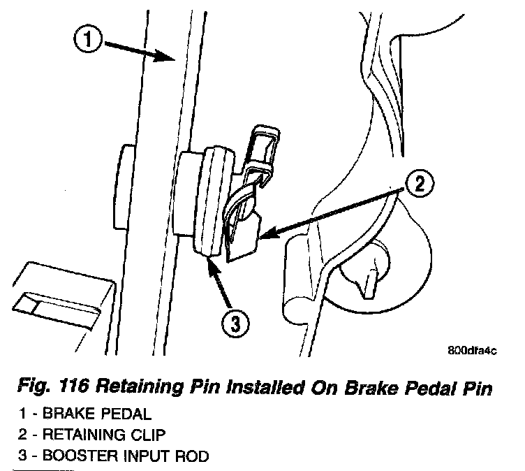 CAUTION: When installing the brake pedal pin on the vacuum booster input rod, do not re-use the old retaining clip.
