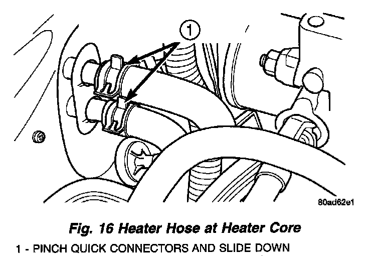 REMOVALThe heater hoses attach at the engine compartment cowl onto the heater core inlet/outlet and on the left side of the engine.