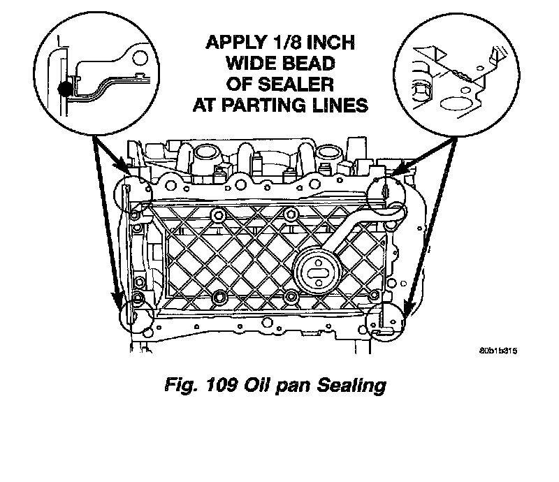 1. Apply a 1/8 inch bead of Mopar Engine RTV GEN II sealer at the parting line of the oil pump housing and the rear seal retainer (Fig. 109).