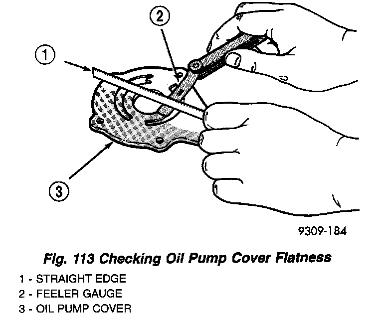 1. Lay a straightedge across the pump cover surface (Fig. 113). If a 0.025 mm (0.001 inch) feeler gauge can be inserted between cover and straight edge, cover should be replaced.