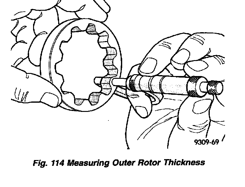 2. Measure thickness and diameter of outer rotor. If outer rotor thickness measures 14.299 mm (0.563 inch) or less (Fig. 114), or if the diameter is 79.78 mm (3.141 inch) or less, replace outer rotor.